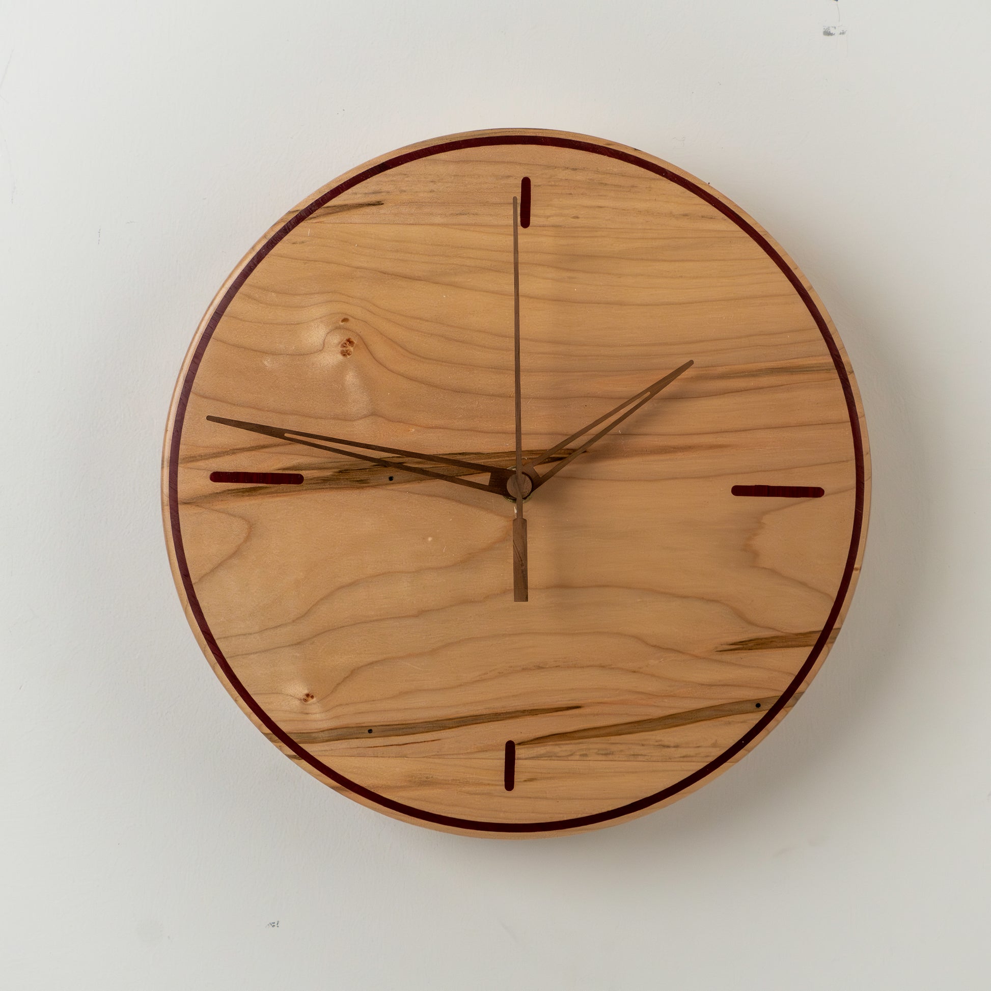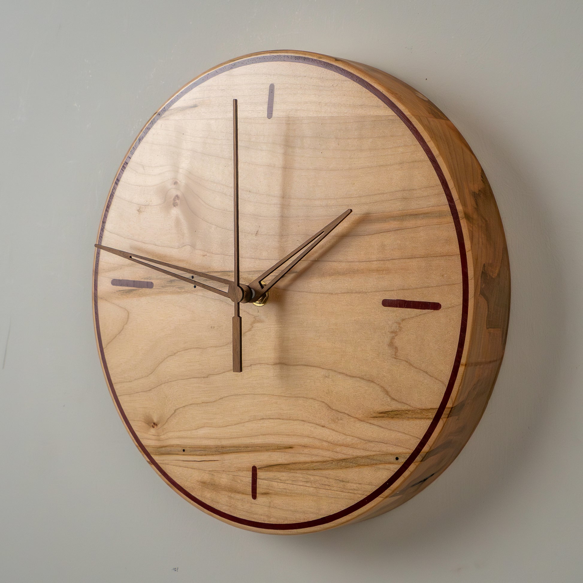 Compact yet bold, this 10-inch wall clock is crafted from solid ambrosia maple nearly 2 inches thick. Walnut inlays mark the hours, with a sleek walnut ring encircling the face for a refined finish. Minimalist and modern with a touch of retro flair, it’s a timeless accent for any space.