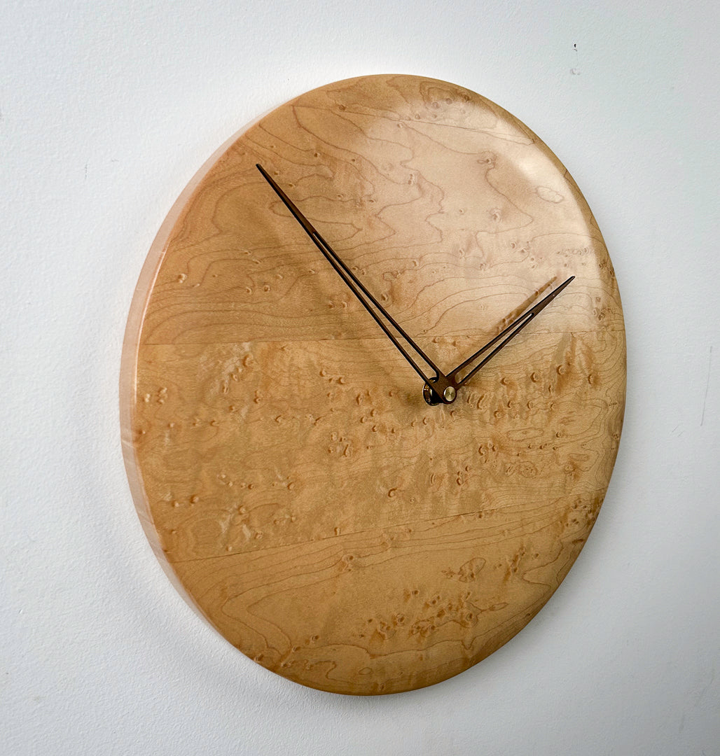 Clean lines meet natural beauty in this 12" minimalist wall clock, handcrafted from striking birdseye maple and finished with a subtle gloss wood wax. Contrasting walnut hands add warmth and elegance to this refined, modern design.