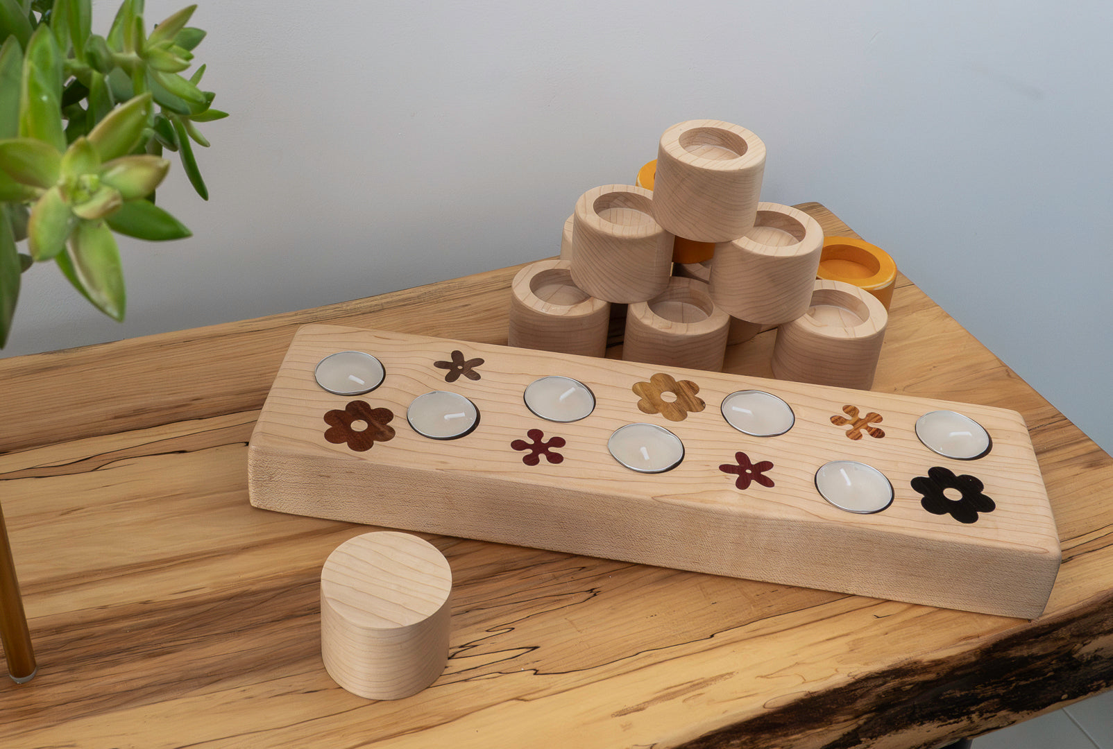 Handcrafted from solid hard maple, this 21" x 4.5" x 2" tea light holder is both functional and artistic. Its surface is adorned with delicate floral motif inlays made from exotic woods including canarywood, purpleheart, nogal, and black walnut—each adding vibrant natural color and contrast.
