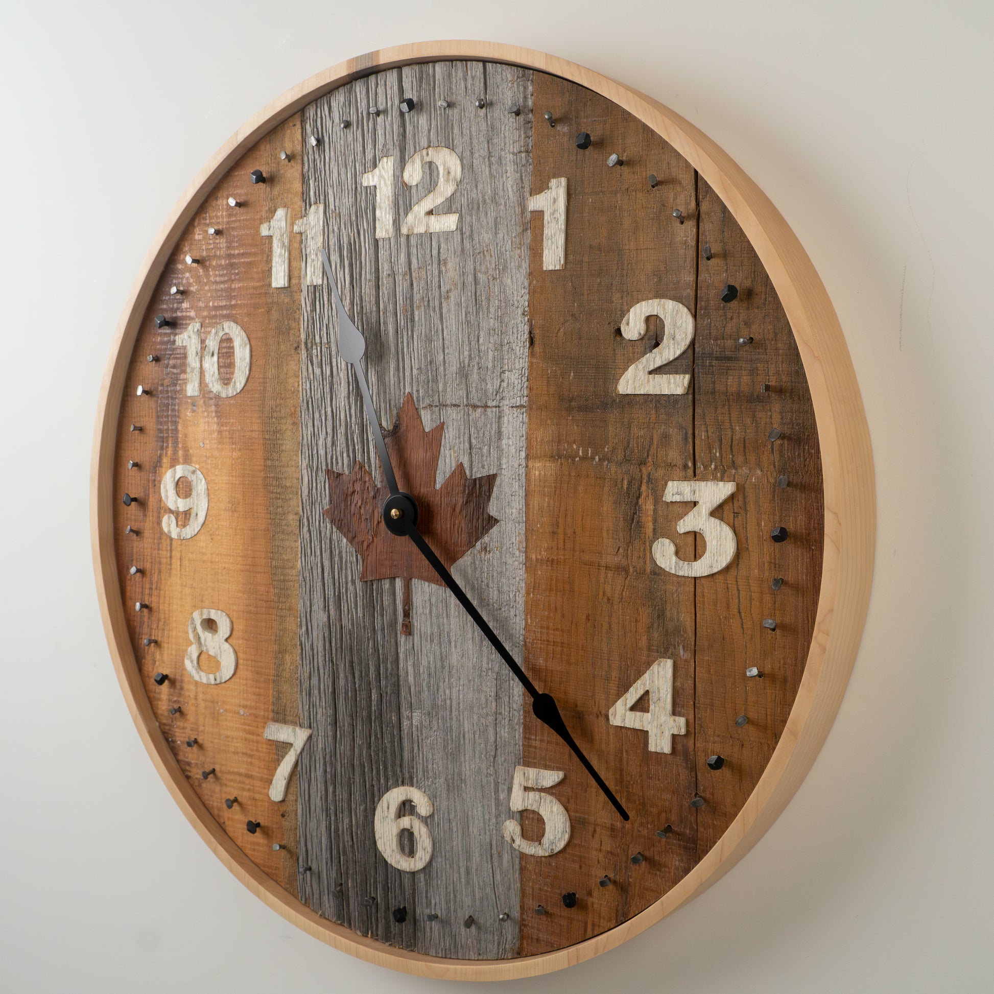 A bold statement piece that reimagines Canadian design. This 23-inch wall clock pairs reclaimed barnboard with a sleek solid maple frame. A stylized maple leaf inlay evokes the Canadian flag, while crisp white barnboard numerals and forged steel nail markers bring a refined industrial edge. Modern craftsmanship meets national heritage in a timeless design for contemporary spaces.